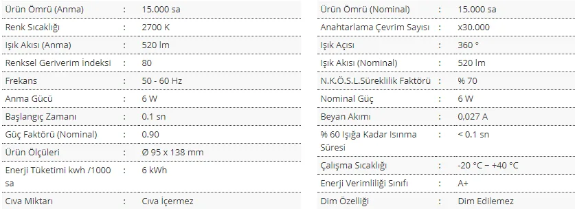 • Enerji Verimliliği – 6W güç tüketimi ile geleneksel ampullere kıyasla önemli ölçüde enerji tasarrufu sağlar.