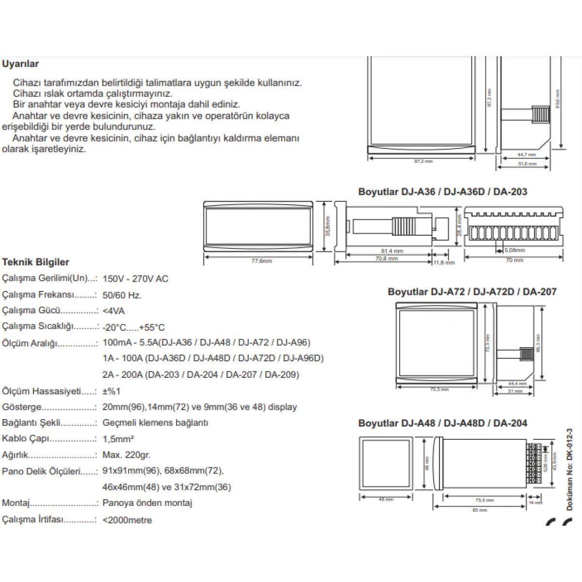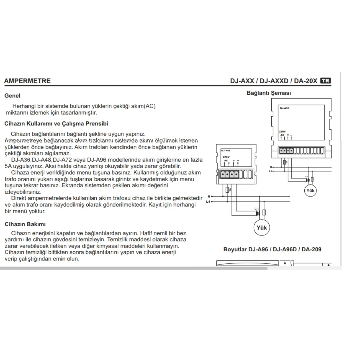 DJ-A48 modeli, kompakt yapısı ve yüksek hassasiyeti ile öne çıkar. Dijital ekranı sayesinde anlık akım değerleri net bir şekilde okunabilir. Dayanıklı yapısı, endüstriyel ortamlarda uzun ömürlü kullanım sunar. Kolay montajı ve standart panel kesiti ile mevcut sistemlere hızlıca entegre edilebilir.