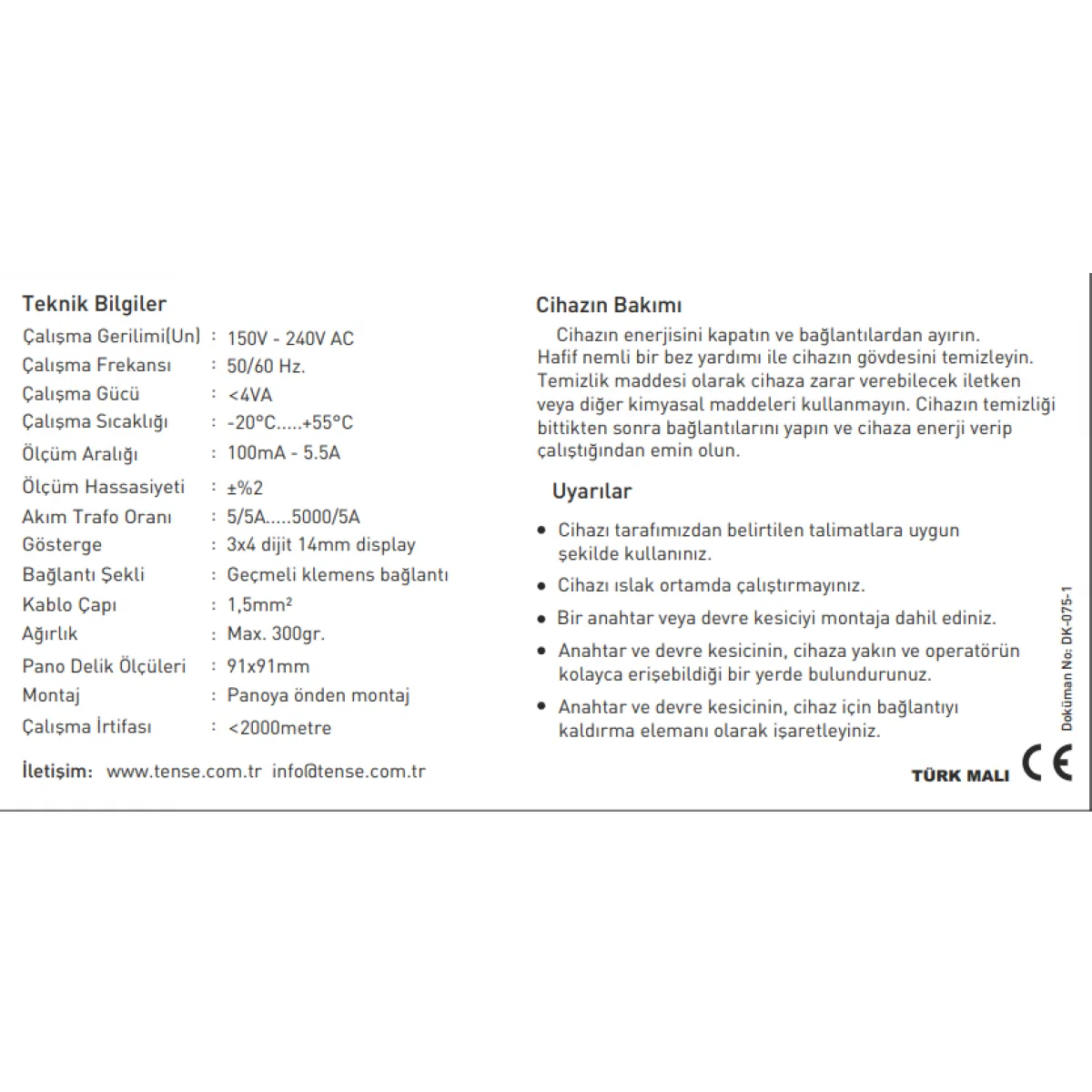 Tense DA-300 Dijital Direkt Ampermetre, (2-250A) DIN Kutu Orijinal fiyat: 3.264,00 ₺.Şu andaki fiyat: 1.534,08 ₺.