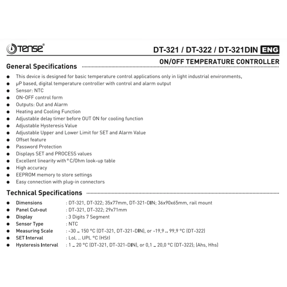 Tense DT-321DIN Sıcaklık Kontrol Cihazı (-30 ile+150 °C) (NTC Ölçüm Probu Fiyata Dahildir.)