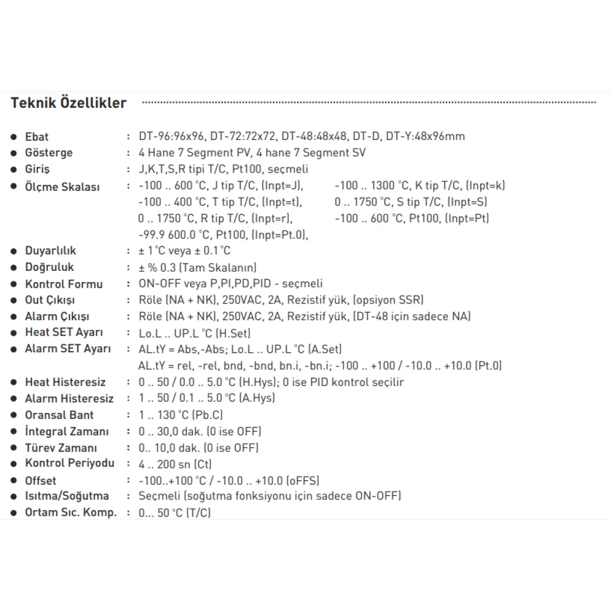 | Fonksiyon | PID,ON-OFF,Alarm ve Kontak Çıkış |