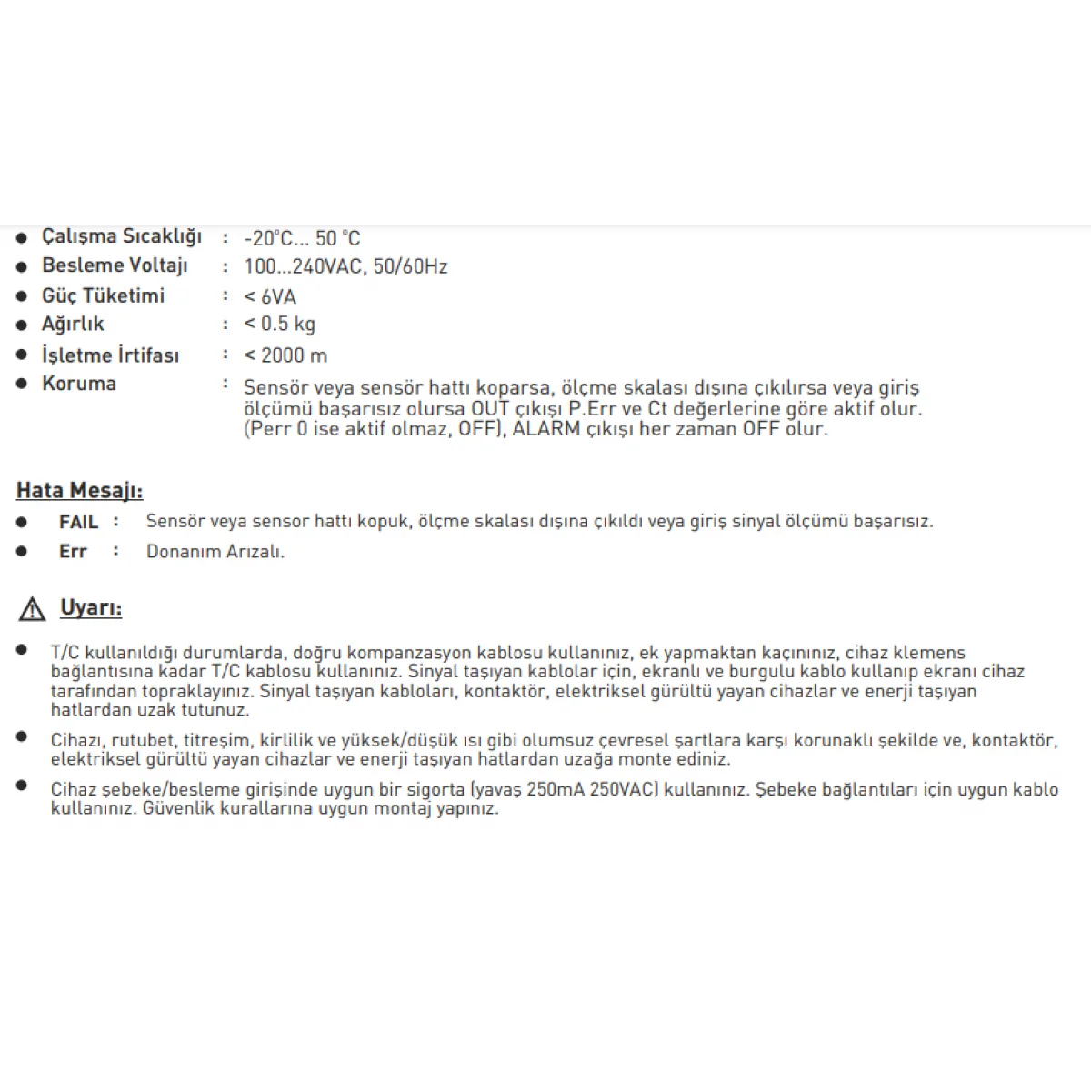 | Sıcaklık Girişleri | J, K, R, S, PT100 |