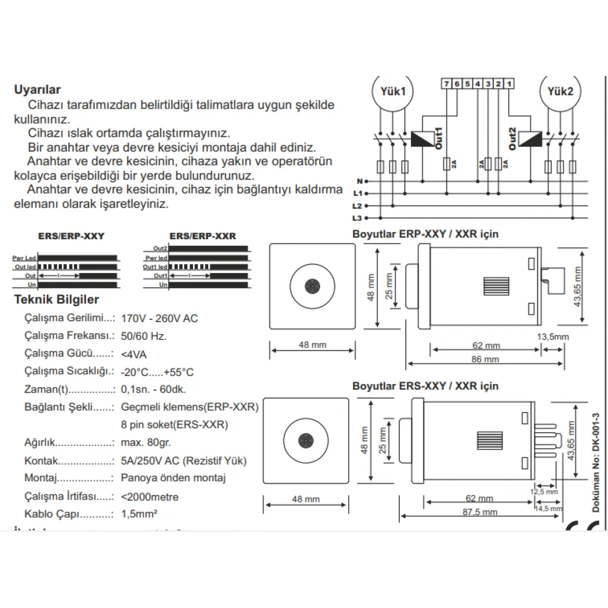 ERS-60Y, kompakt boyutu ve sunduğu gelişmiş özelliklerle öne çıkar. 8 pinli soket yapısı sayesinde kolay montaj ve bağlantı imkanı sunarken, 48x48mm’lik standart pano boyutu mevcut panolara entegrasyonu kolaylaştırır. Ayarlanabilir zamanlama aralığı ve hassas tetikleme yeteneği, onu çeşitli endüstriyel uygulamalar için esnek bir çözüm haline getirir.
