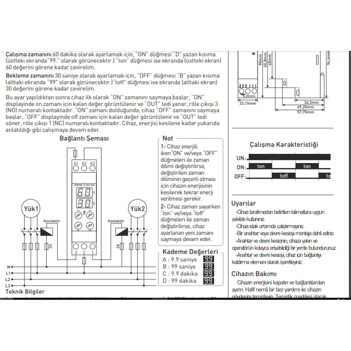 Tense ERV-09D, sunduğu çok yönlü fonksiyonlar ve endüstriyel kullanıma uygun sağlam yapısı ile öne çıkar. Farklı zamanlama modları sayesinde tek bir ürünle geniş bir uygulama yelpazesine çözüm sunar. Yüksek hassasiyetli zamanlama yeteneği, kritik endüstriyel süreçlerde hatasız çalışmayı garanti eder. DIN rayı montajına uygun kompakt ve dayanıklı kutu tasarımı, pano içi entegrasyonu kolaylaştırır ve uzun ömürlü bir kullanım vaat eder.